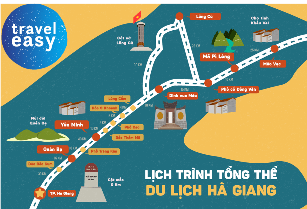 Đi làm sao: Nếu đi từ TP.HCM thì phải bay ra Hà Nội trước rồi từ Hà Nội mình có nhiều lựa chọn. Do quãng đường khá dài và hiểm trở – tận 450km từ Hà Nội lên điểm cuối Lũng Cú, nếu di chuyển ban ngày thì gần như bạn sẽ mất 2 ngày di chuyển – 1 ngày đi, 1 ngày về. Di chuyển Hà Nội <-> TP. Hà Giang (300km/ 1 chiều – 6 tiếng di chuyển) 1-Phổ biến nhất là đi xe khách lên đến thành phố Hà Giang. Xe khách thì có rất nhiều loại khác nhau. Xe limousine 9 chỗ/19 chỗ, xe giường nằm, xe thông thường. Xe limo là thoải mái nhất – đón tại trung tâm hà nội hoặc sân bay nội bài luôn. Ban ngày thì thường xuất phát 7h – 11h – 13h. Tối thì 9-10h. Giá vé 1 người tầm 300-350k. 2-Thuê taxi hoặc oto có lái riêng – khá tiện lợi và chủ động nhưng chi phí khá cao – tầm 3-4 triệu tùy loại xe. 3-Phượt bằng xe máy – tuy nhiên đường từ Hà Nội lên TP.Hà Giang cũng không có gì đặc sắc lắm nên bạn nên tiết kiệm sức lực nhé. Di chuyển TP. Hà Giang <-> các điểm du lịch (200km/ 1 chiều – 5 tiếng di chuyển) 1-Khoảng cách giữa các điểm chơi ở Hà Giang sẽ lần lượt theo thứ tự như sau: - Thành phố Hà Giang - cổng trời Quản Bạ: 47km. - Cổng trời Quản Bạ - rừng thông Yên Minh: 36km. - Rừng thông Yên Minh - Nhà của Pao: 40km. - Nhà của Pao - Dinh nhà Vương: 10km. - Dinh nhà Vương - phố cổ Đồng Văn: 10km. - Phố cổ Đồng Văn - cột cờ Lũng Cú: 30km. - Cột cờ Lũng Cú - Mã Pì Lèng: 35-40km - Mã Pì Lèng – bến thuyền sông Nho Quế: 10km chạy xe + 2km đi bộ đường núi. 2-Từ Hà Giang, phương tiện bổ biến nhất là tự thuê XE MÁY đi lên các điểm du lịch chính. Bạn nào không chạy xe máy được thì có thể thuê dịch vụ xe ôm nhé. Các bạn tài xế xe máy sẽ chở bạn suốt chuyến luôn nhé. 3-Thuê xe ôtô có lái riêng – khá tiện lợi và chủ động nhưng chi phí khá cao – tầm 2-3 triệu/ 1 ngày tùy loại xe. 4-Xe khách cũng có nhưng sẽ khá bất tiện nếu bạn muốn dừng lại ở các điểm tham quan nhé nên hiện tại bạn chỉ nên sử dụng 2 phương tiện trên.