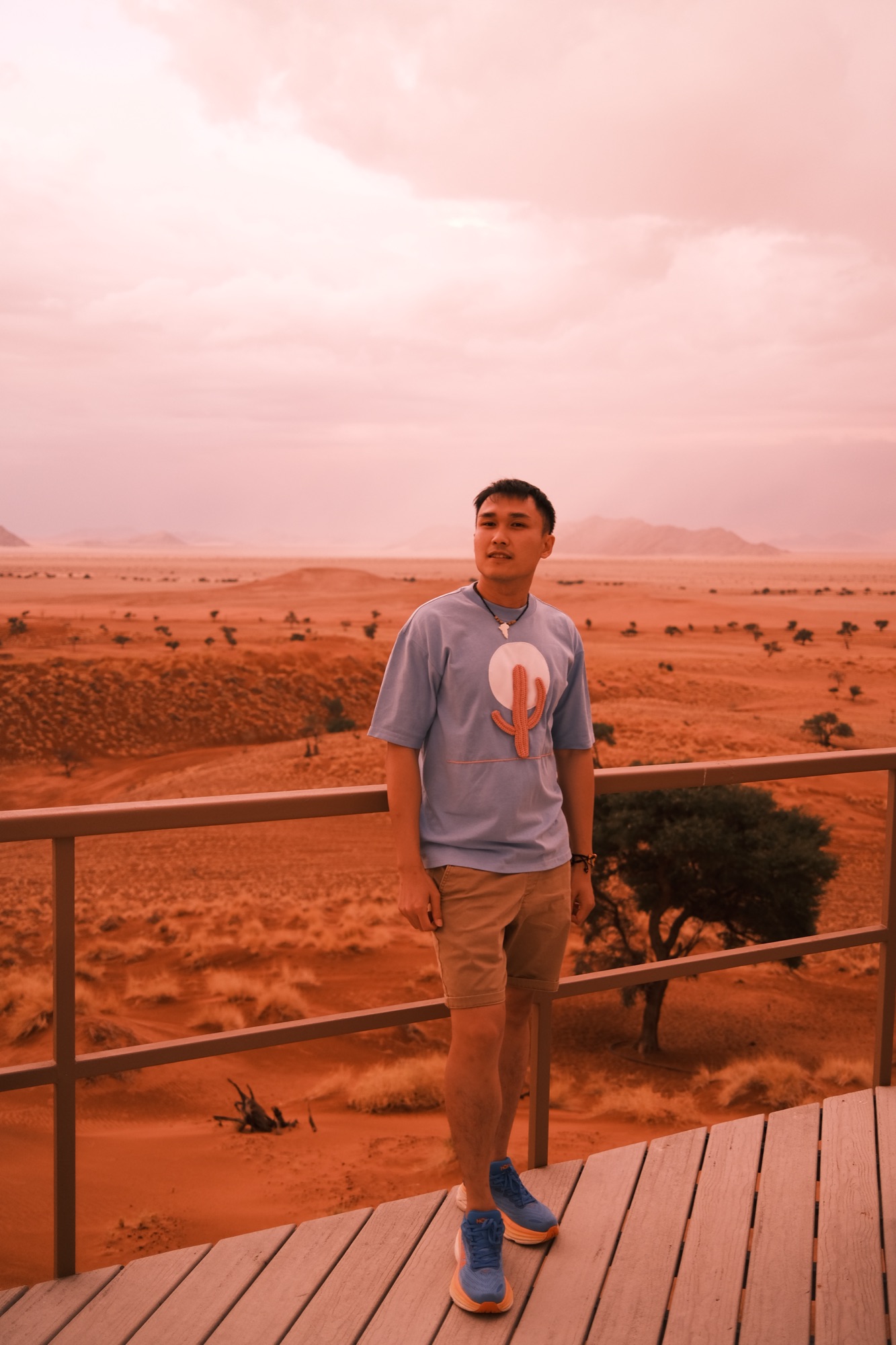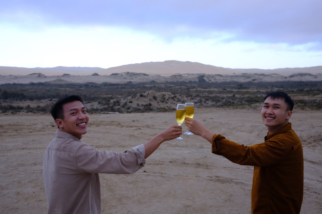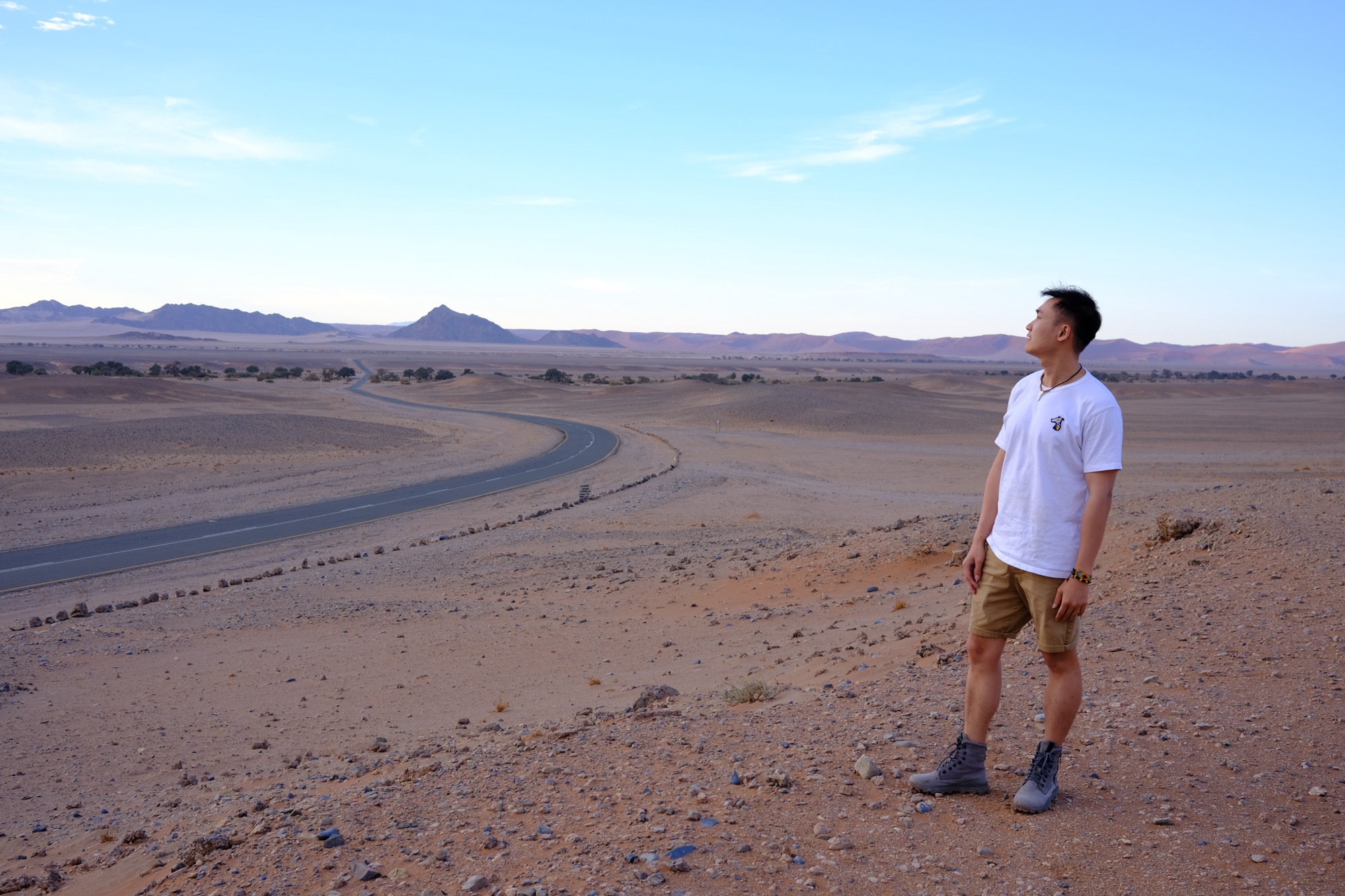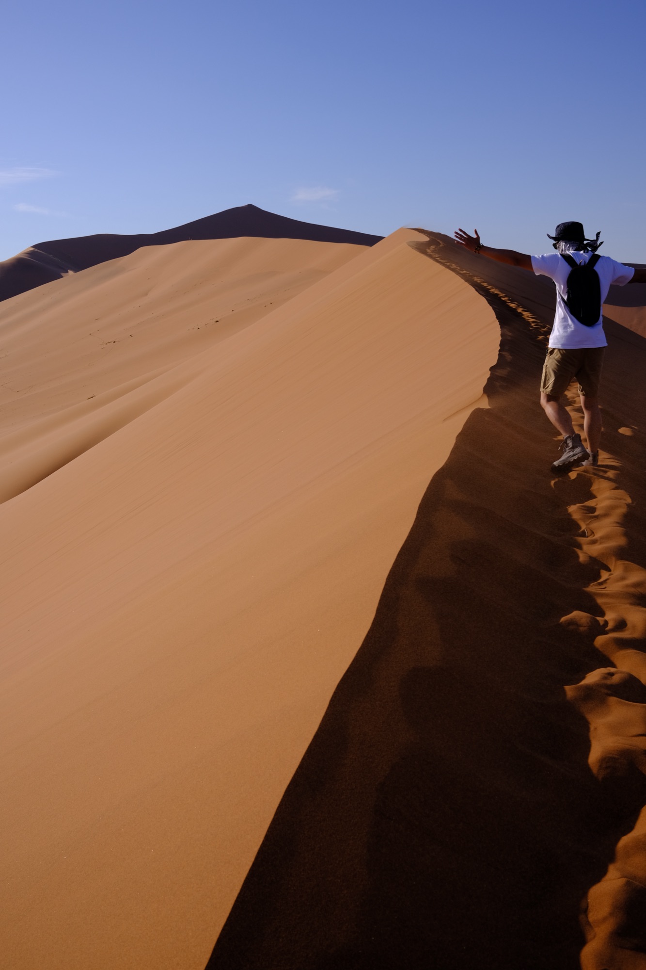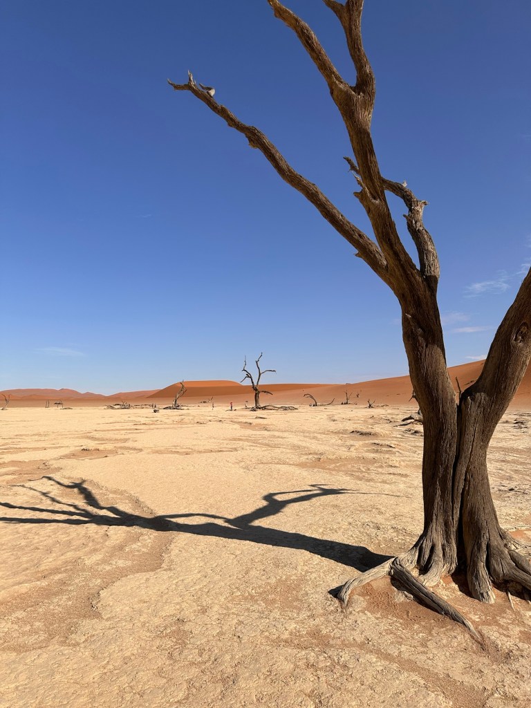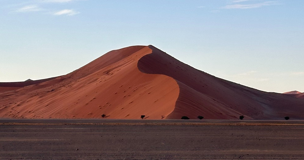 +Ngày 2: dậy thật sớm nhé – nên khởi hành từ 5:30 và trễ nhất 6h – đi 1 mạch tới Sossusvlei và sau đó là Dead Valley (tầm 60km). Ưu tiên leo lên Big Daddy trong lúc trời còn mát và chưa nóng lắm. Chỉ cần tới tầm 7:30-8h hơn là trời đã rất nắng nóng rồi nhé. Sau đó trên đường về có thể lái chầm chậm để chụp ảnh và ghé các điểm khác như Dune 45 hoặc view point trên cao (giữa Sesriem và Sossusvlei). Lái về lại khách sạn nghỉ ngơi. Đức recommend nghỉ đêm thứ 2 tại Namib Dune Star – ngắm hoàng hồn trên đồi cao và ngủ trên giường dưới bầu trời để ngắm sao vào ban đêm nhé.